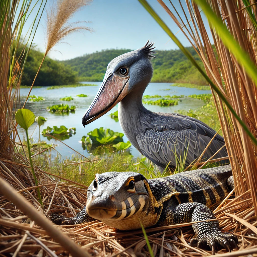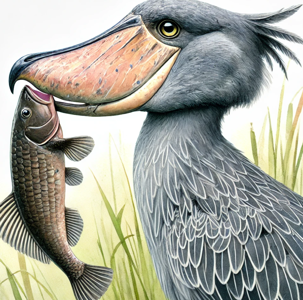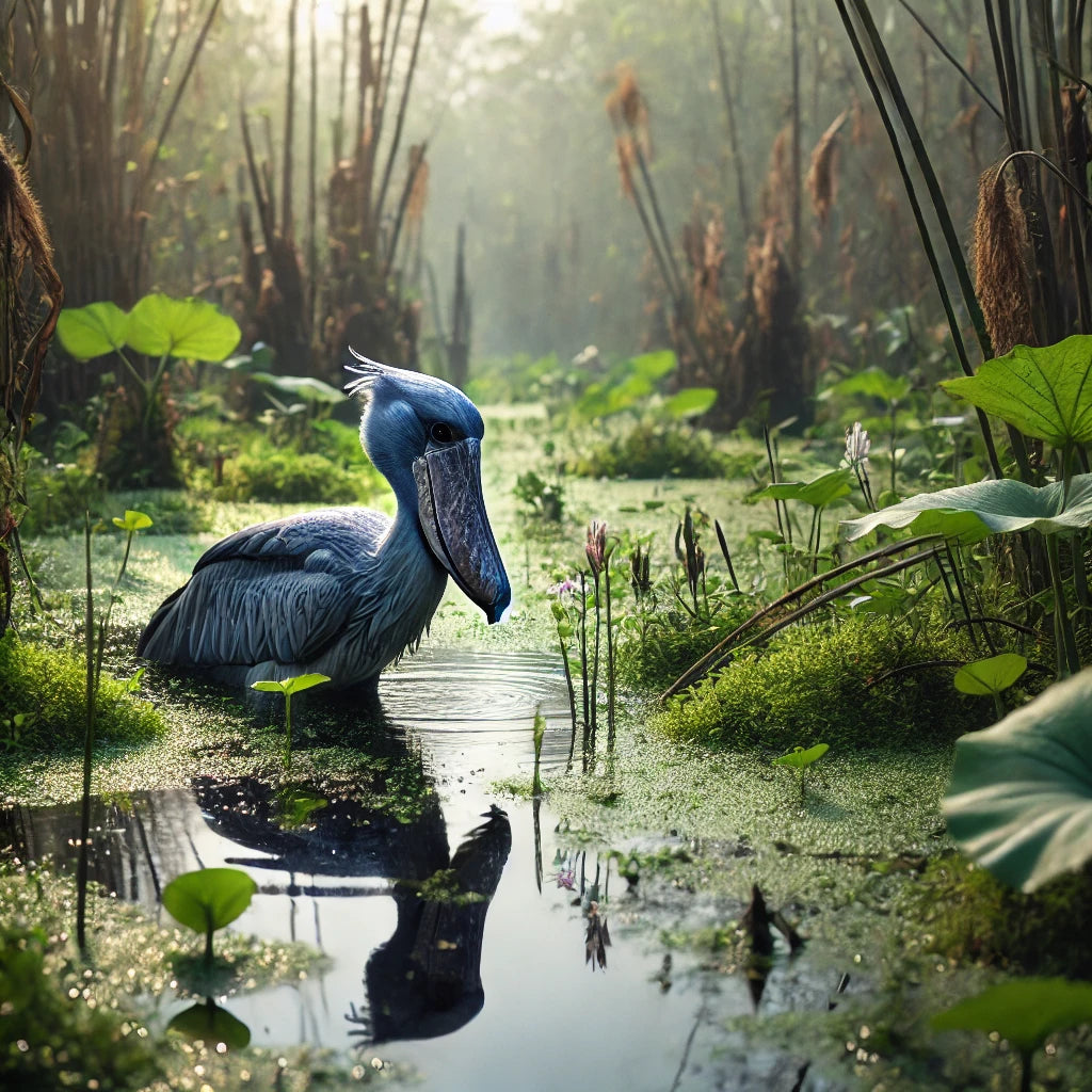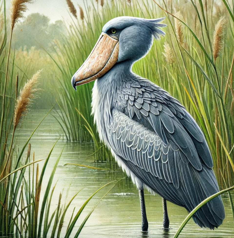 ShoebillThe Shoebill is a statuesque bird with a shoe-shaped bill, found in East Africa's marshes, leading a solitary life.