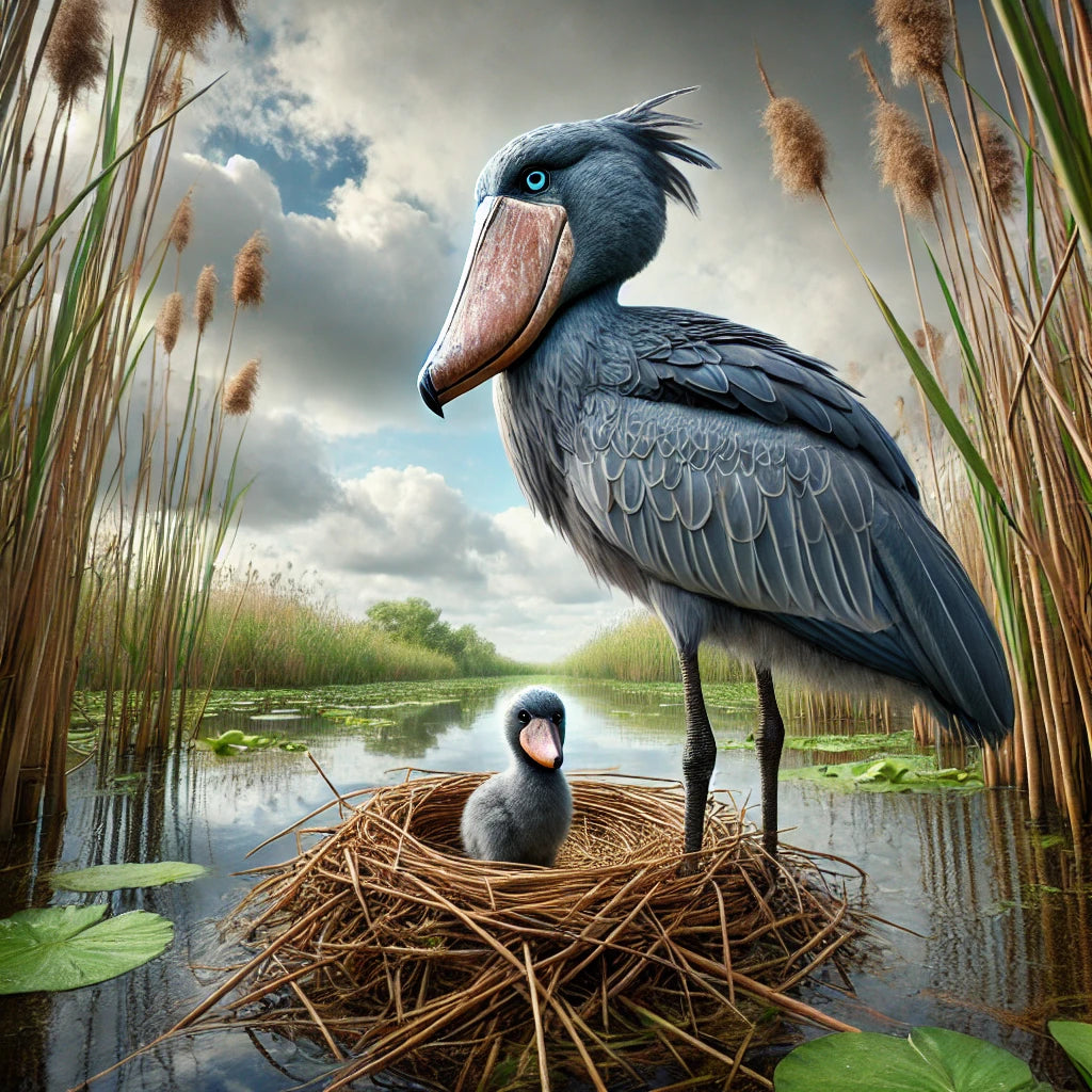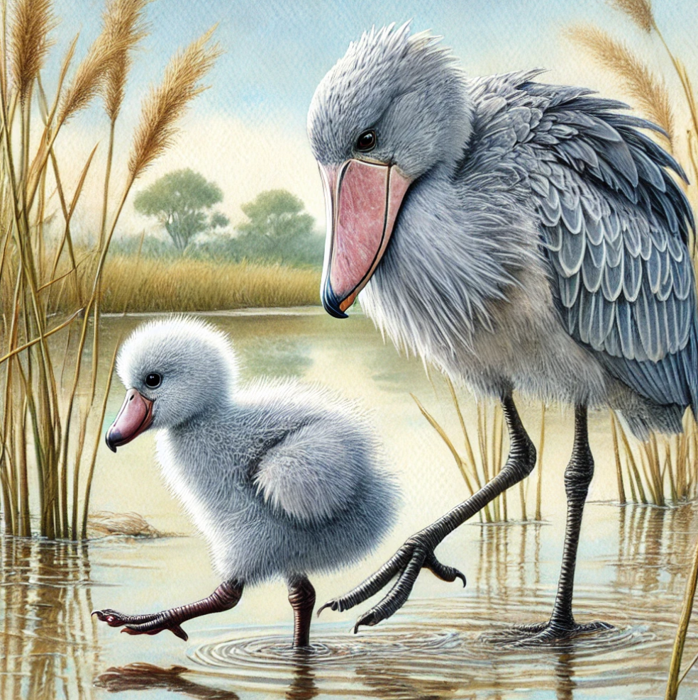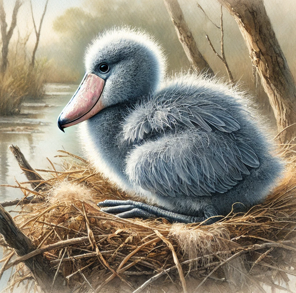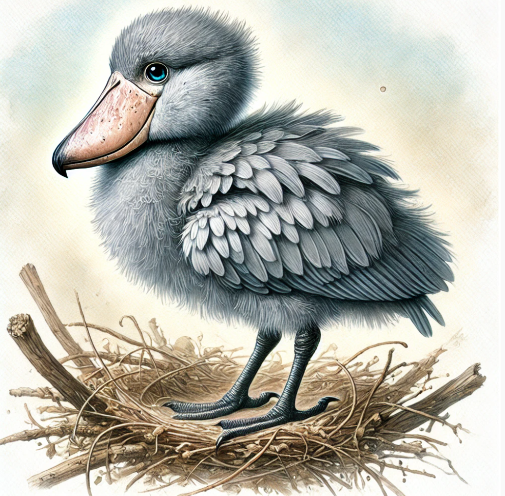 Baby ShoebillBaby Shoebills: fluffy, oversized, and charming, growing into majestic, dinosaur-like birds