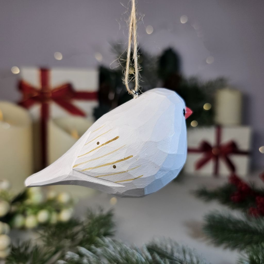 Each ornament is hand-painted to showcase the finch’s distinctive black and white stripes, along with its bright orange beak and cheek patches, perfectly capturing its playful and vibrant essence. Measuring approximately 2-3 inches in height, this ornament is designed to be a joyful addition to any Christmas tree or festive display, drawing admiration and smiles from all.